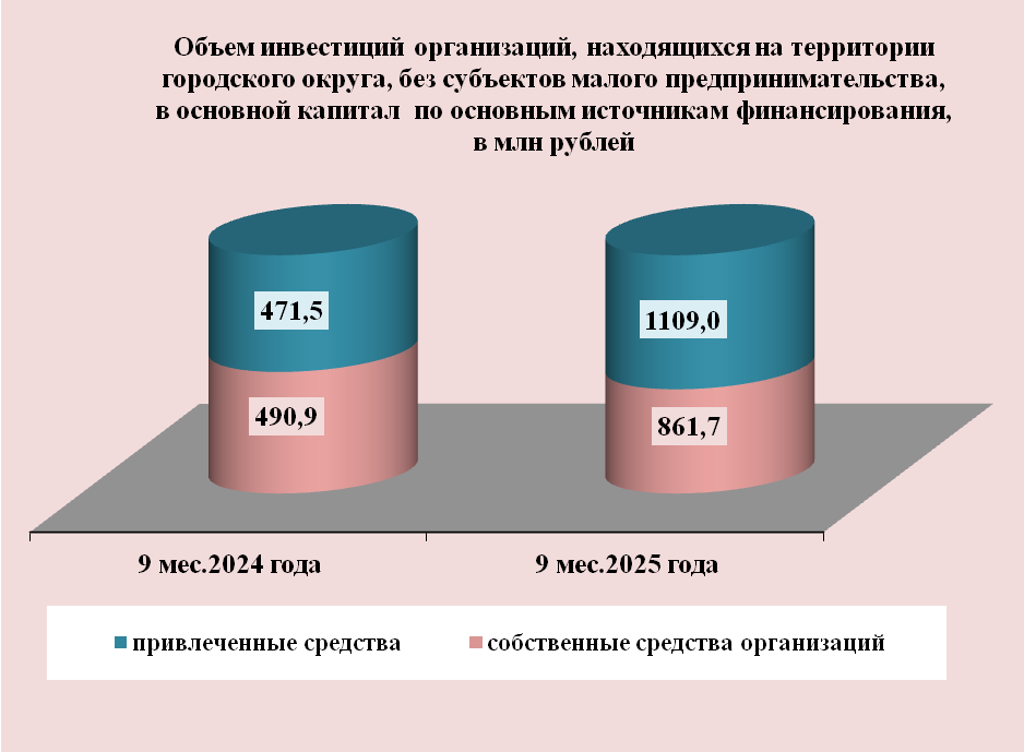 Инвестиции в основной капитал по организациям, находящимся на территории городского округа без субъектов малого предпринимательства, за 9 месяцев 2025 года составили 1 970,7 млн рублей, темп роста объема инвестиций в основной капитал 195,1 %.
