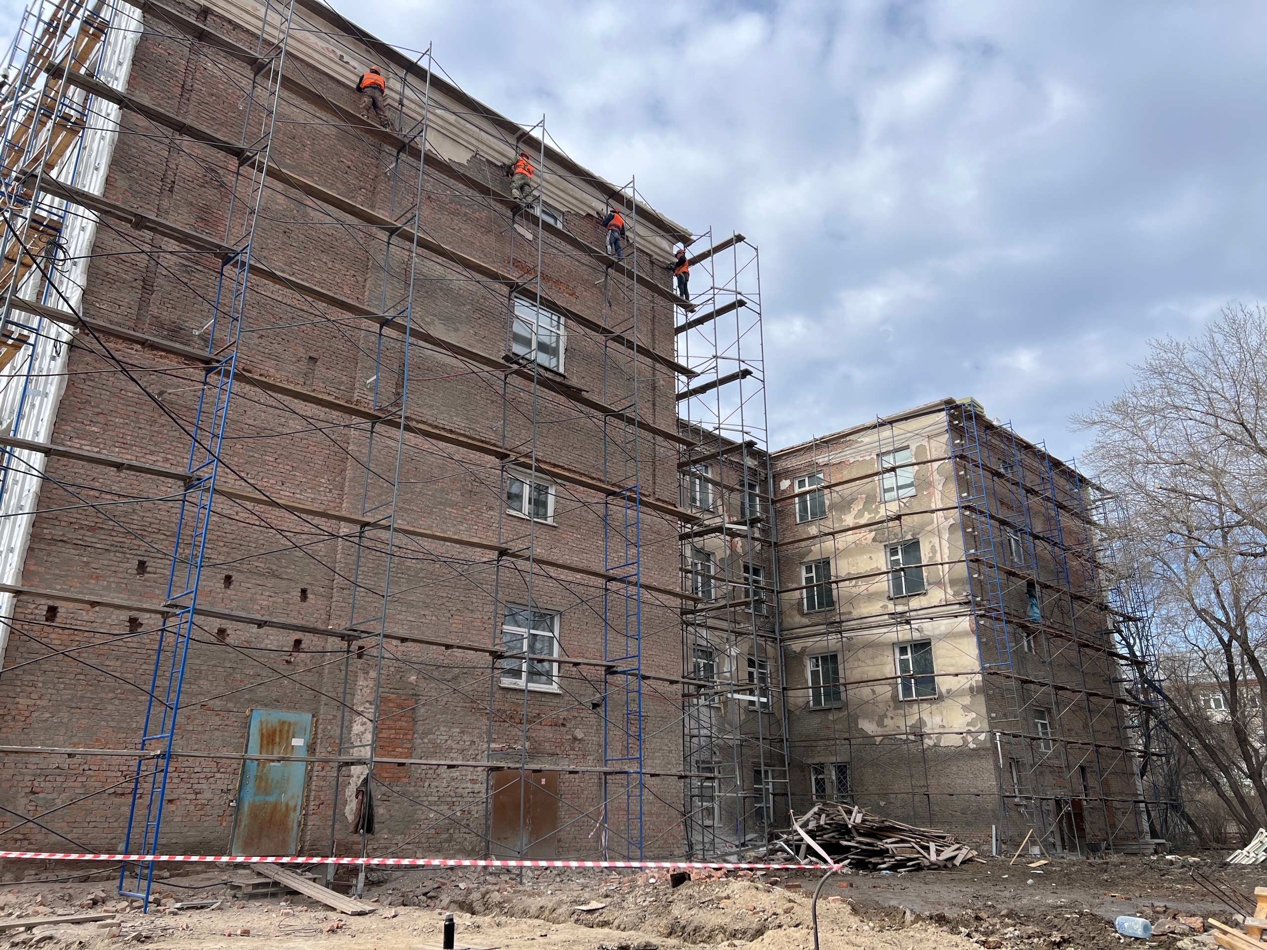 На южной, западной и восточной стенах уже смонтировали утеплитель и закрепили ветровлагозащитный материал. На северной стене пока продолжаются демонтажные работы.