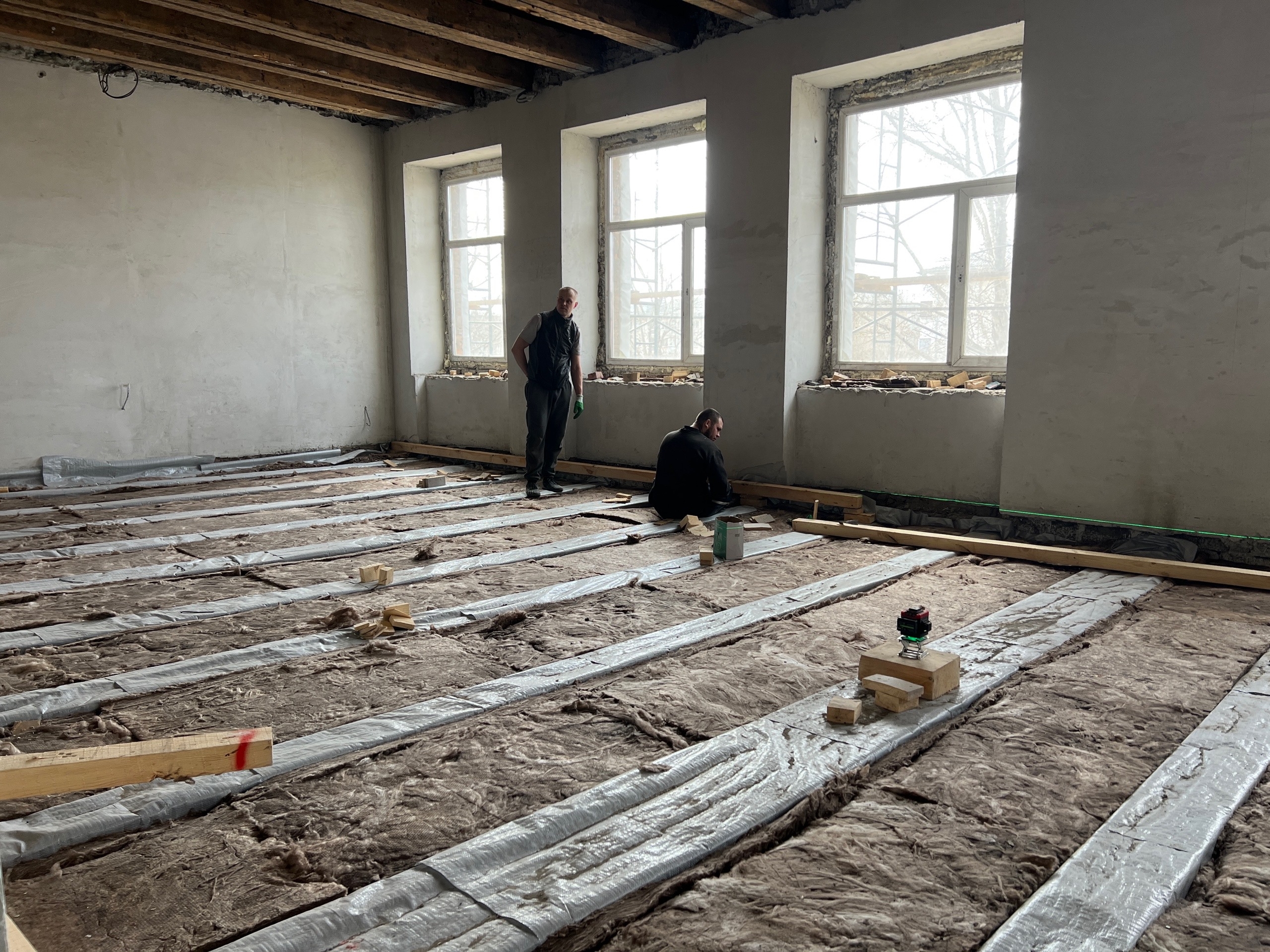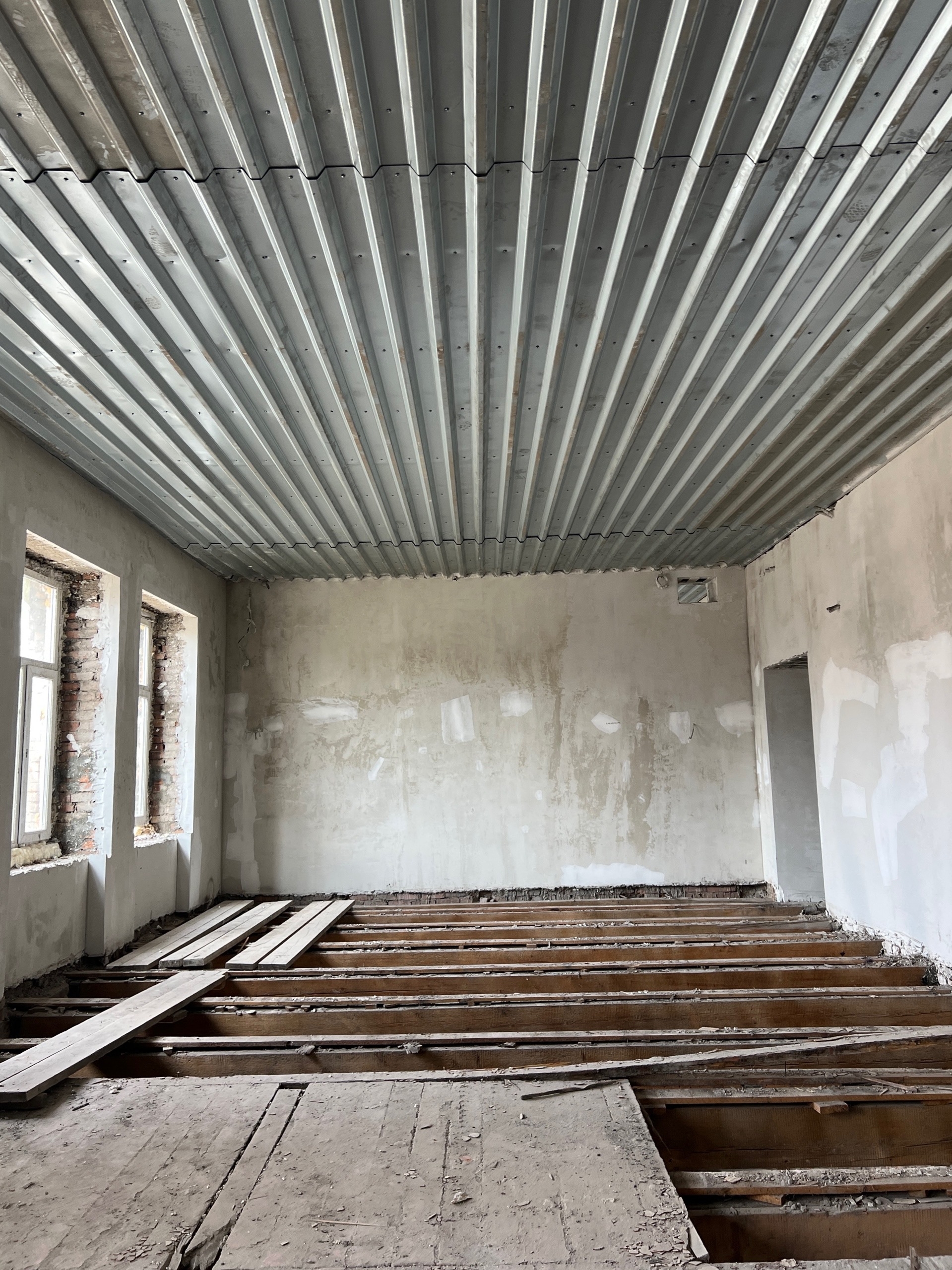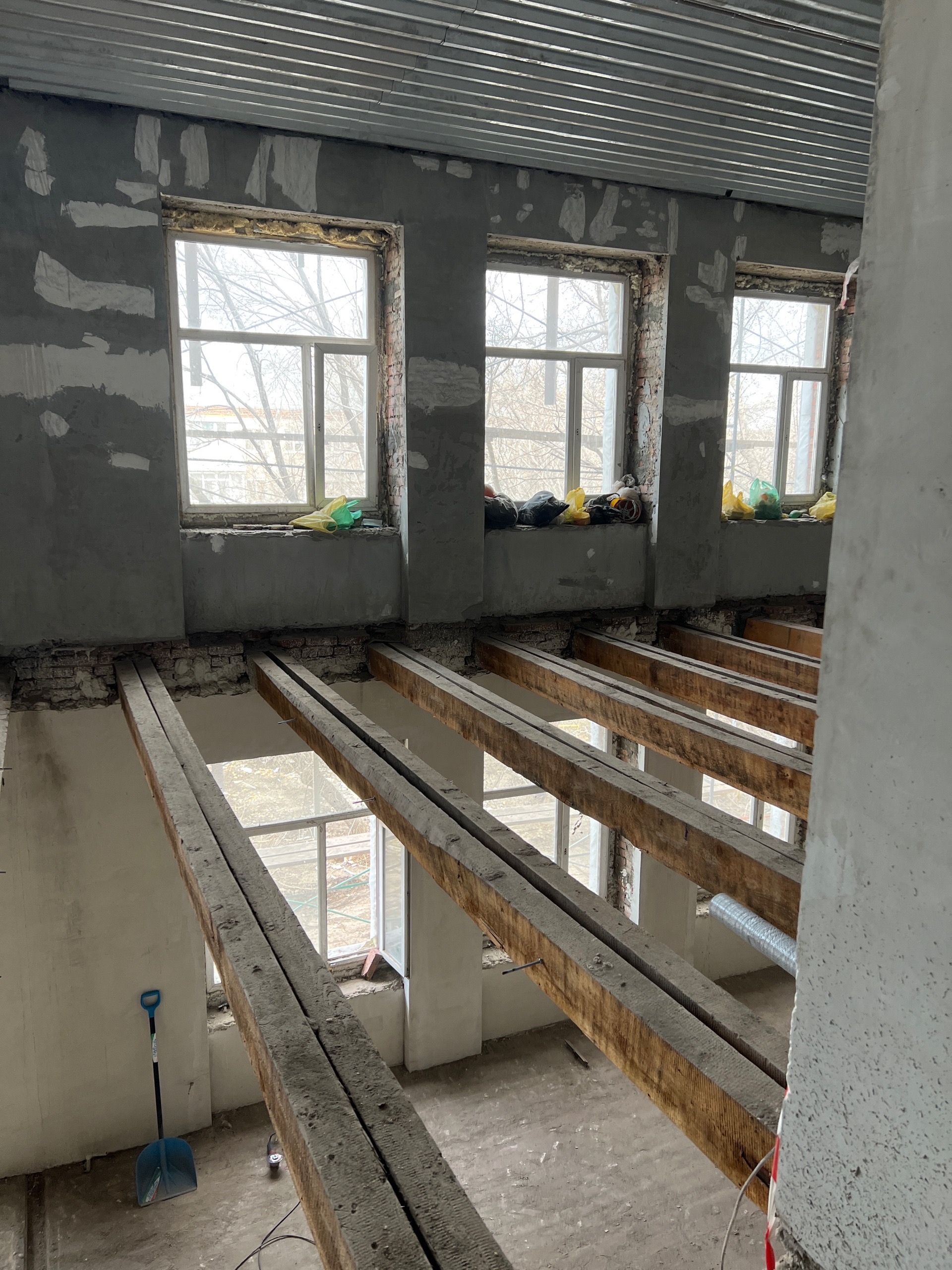 со второго по четвёртый этажи полностью выполнено черновое оштукатуривание. На первом этаже полностью залит монолитный пол. Параллельно ведётся демонтаж межэтажных перекрытий. На четвёртом и третьем этажах уже начали зашивать профлистом балки перекрытия и укладывать утеплитель. В отдельных помещениях готовят напольные основания.