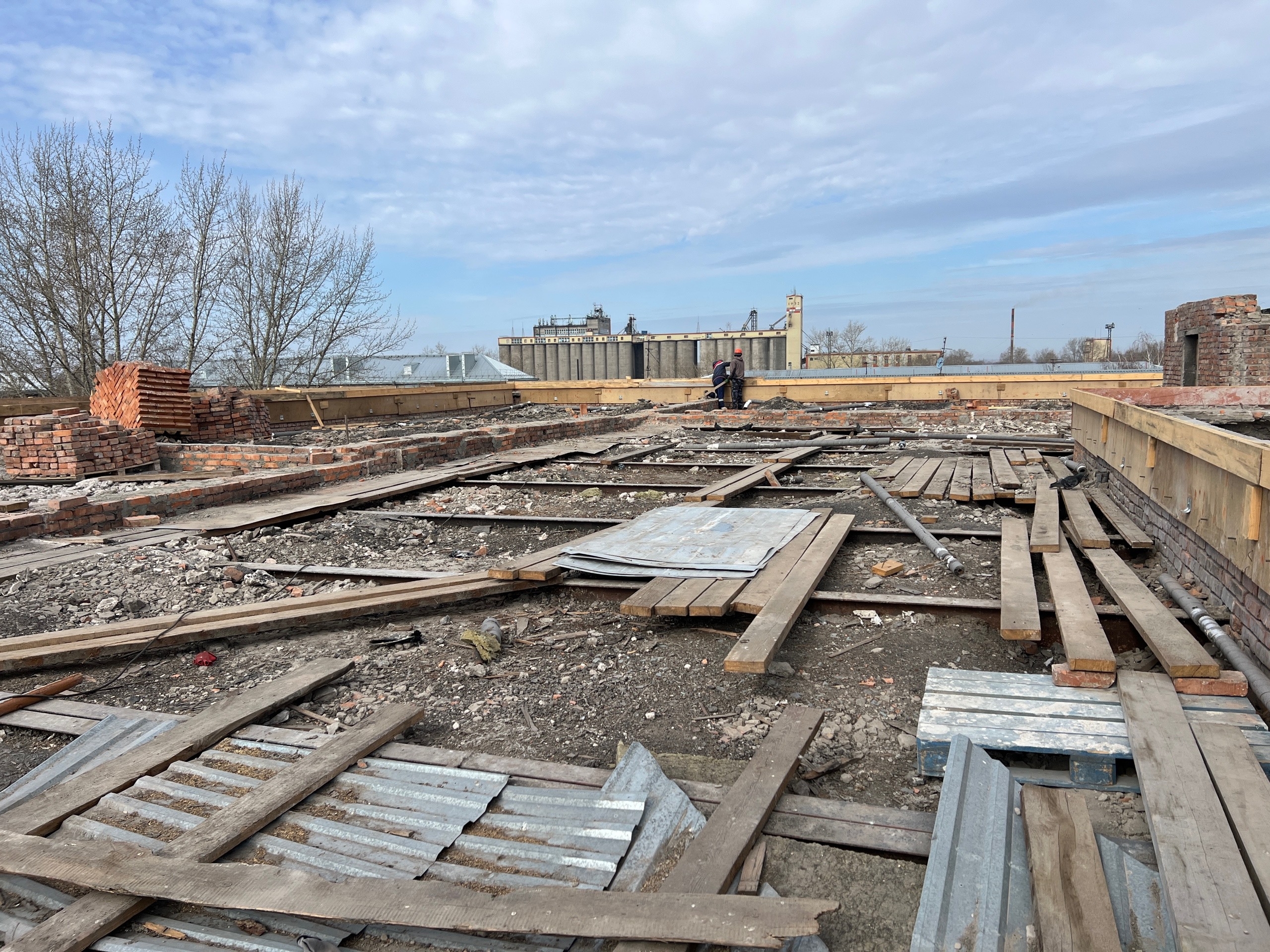 С понедельника текущей недели подрядчик приступил к работам на крыше здания. Сейчас по всему периметру готовят опалубку для заливки армированного пояса.