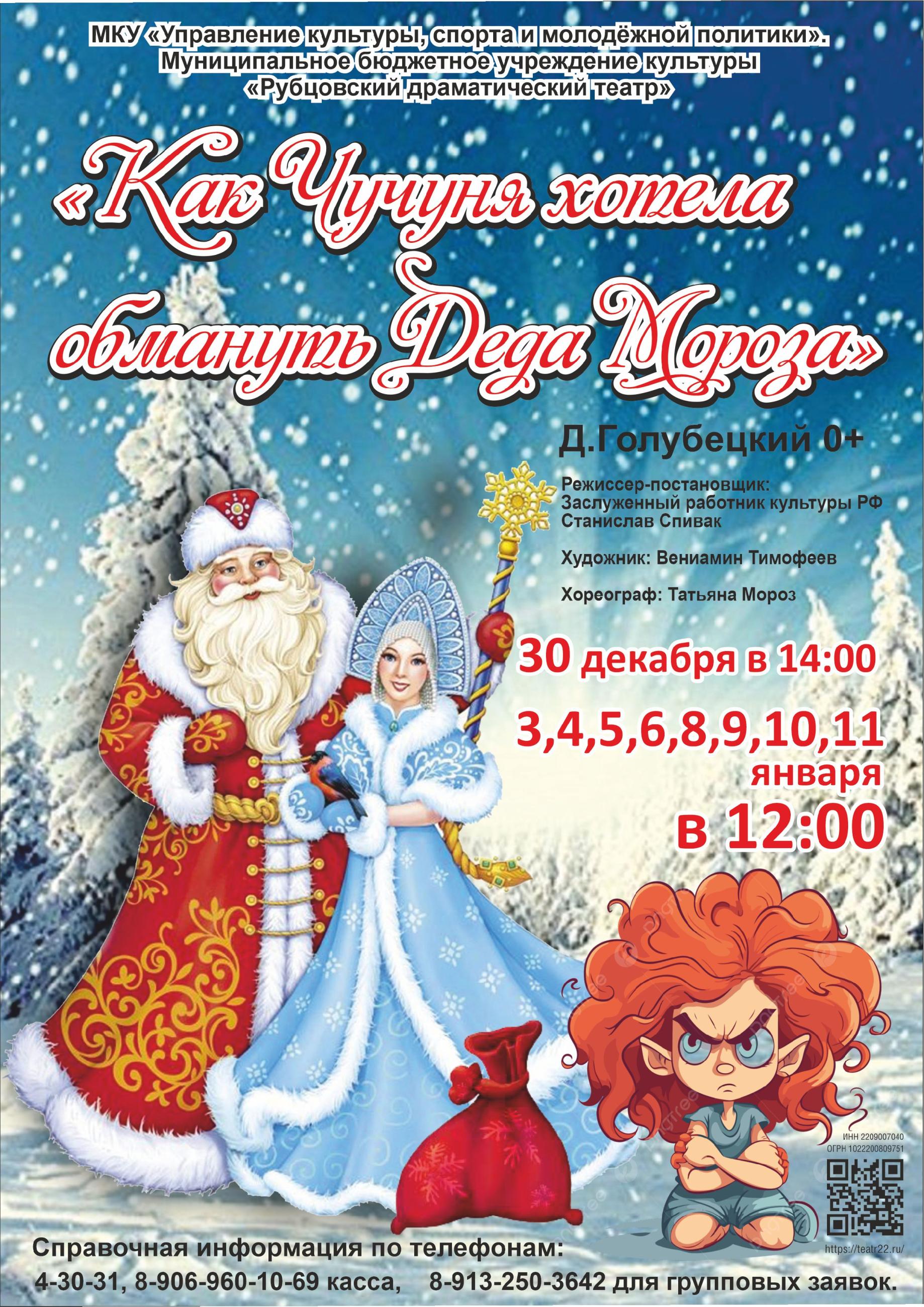 Рубцовский драматический театр приглашает во время новогодних каникул и рождественских праздников на семейный просмотр премьерного новогоднего спектакля «Как Чучуня хотела обмануть Деда Мороза». Яркий музыкальный спектакль поставлен по пьесе Дмитрия Голубецкого режиссером театра, заслуженным работником культуры Станиславом Спиваком.