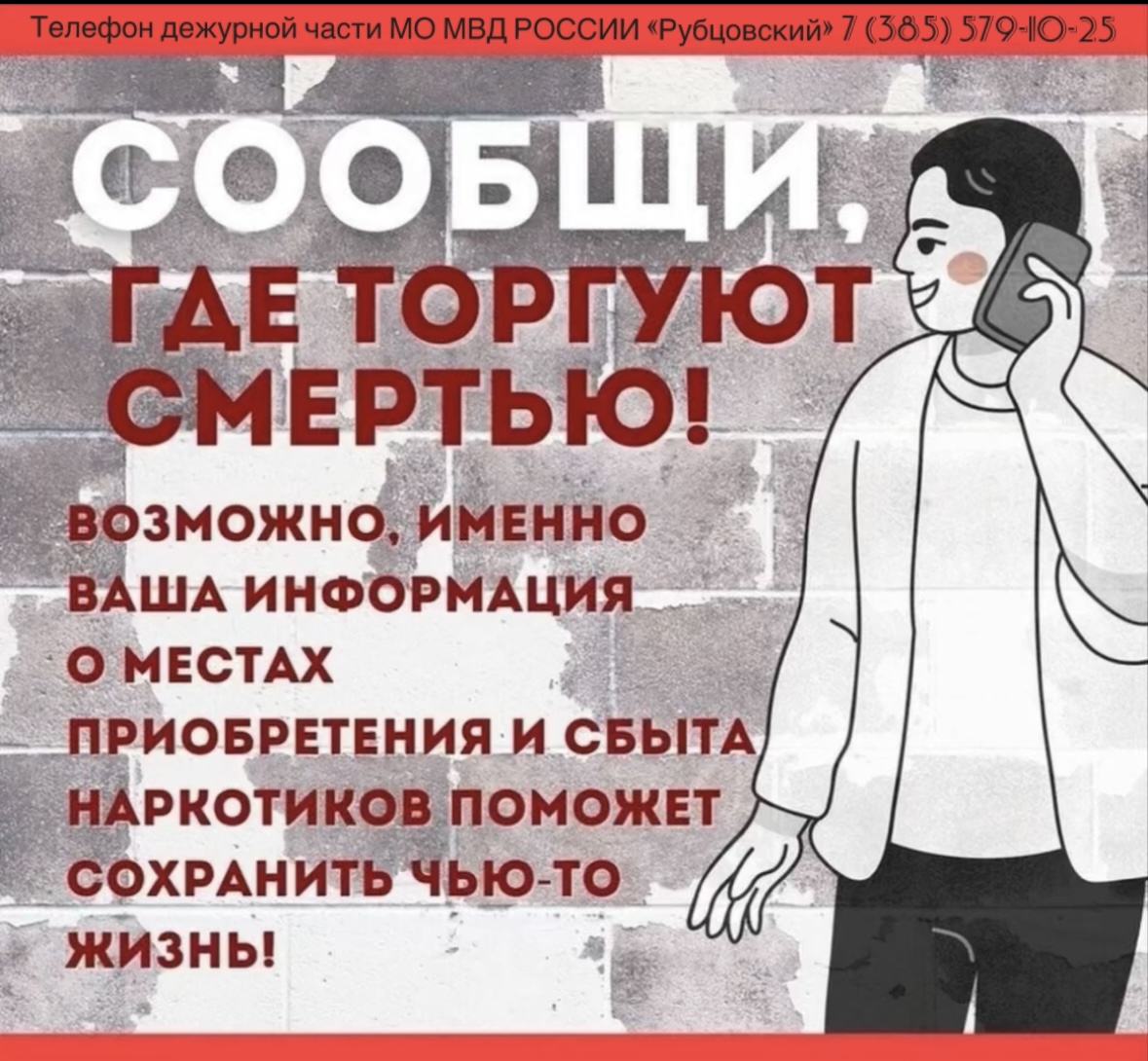 Уважаемые рубцовчане, эффективное противодействие этой угрозе напрямую зависит от вашей гражданской позиции, участия и бдительности. Если вы стали свидетелем противоправных действий, связанных с незаконным оборотом наркотиков, вашим долгом является незамедлительное сообщение об этом в правоохранительные органы.