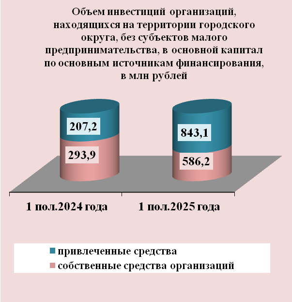 Инвестиции в основной капитал по организациям, находящимся на территории городского округа без субъектов малого предпринимательства, за 1 полугодие 2025 года составил 1 429,3 млн рублей, темп роста объема инвестиций в основной капитал составил 277,8 %.