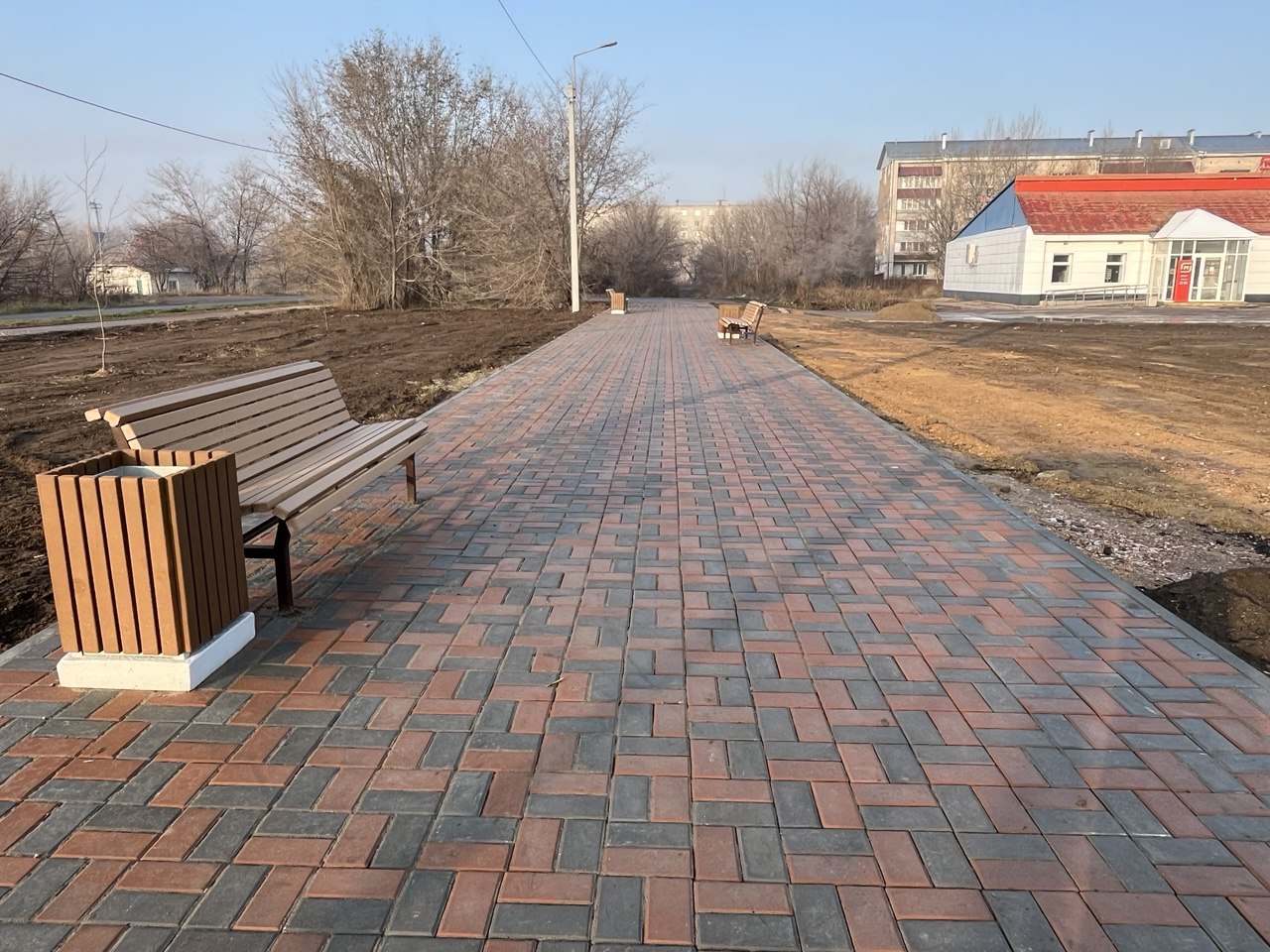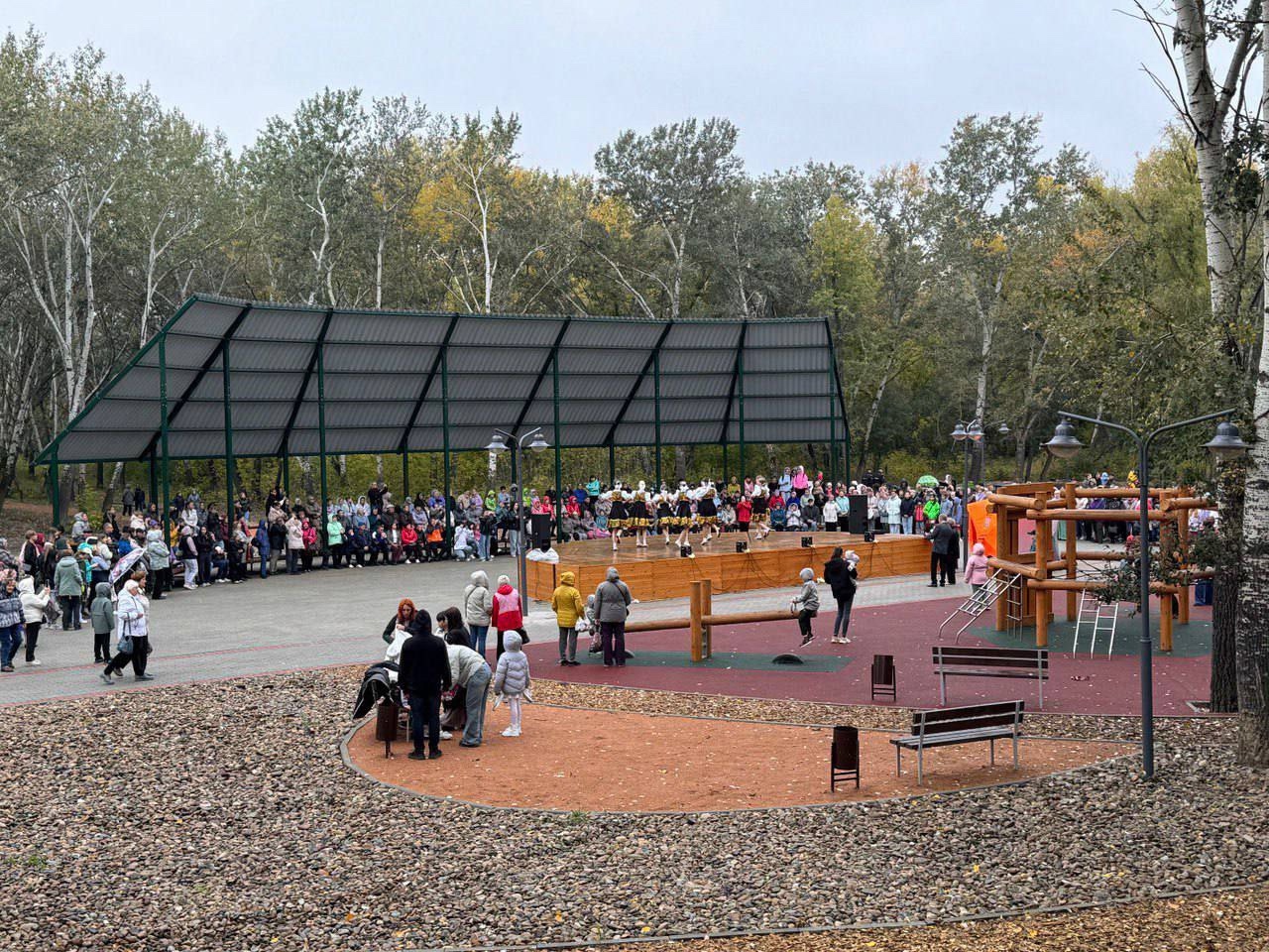 Центральная площадь стала сердцем новой общественной территории — там находятся современные детские игровые комплексы, просторная сценическая площадка с трибунами и освещением для проведения культурных мероприятий, а также зона с торговыми павильонами.