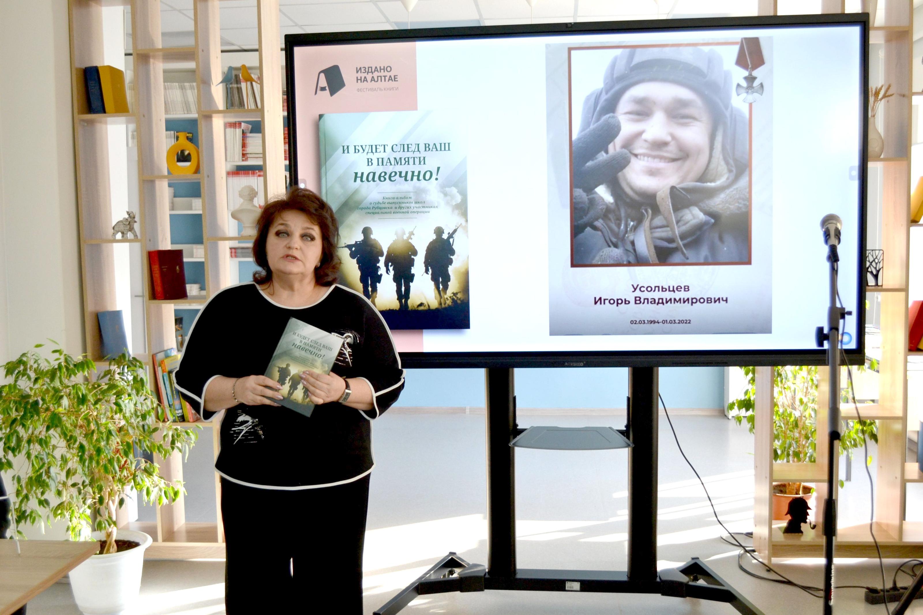 В рамках краевого фестиваля книги «Издано на Алтае» в Центральной городской библиотеке Рубцовска состоялась презентация книги «И будет след ваш в памяти навечно!», изданной музеем образования при поддержке управления образования города Рубцовска в 2025 году. Это книга-альбом о судьбе выпускников школ города – участниках специальной военной операции. Составителем сборника является Валентина Николаевна Тибекина – руководитель музея образования, заслуженный учитель РФ, почётный гражданин города Рубцовска.