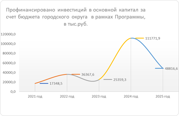 За последние 5 лет величина объема инвестиций в основной капитал за счет бюджета городского округа в рамках Программы менялась от минимальной суммы 17,3 млн рублей в 2021 году до максимальной суммы 111,8 млн рублей в 2024 году:
