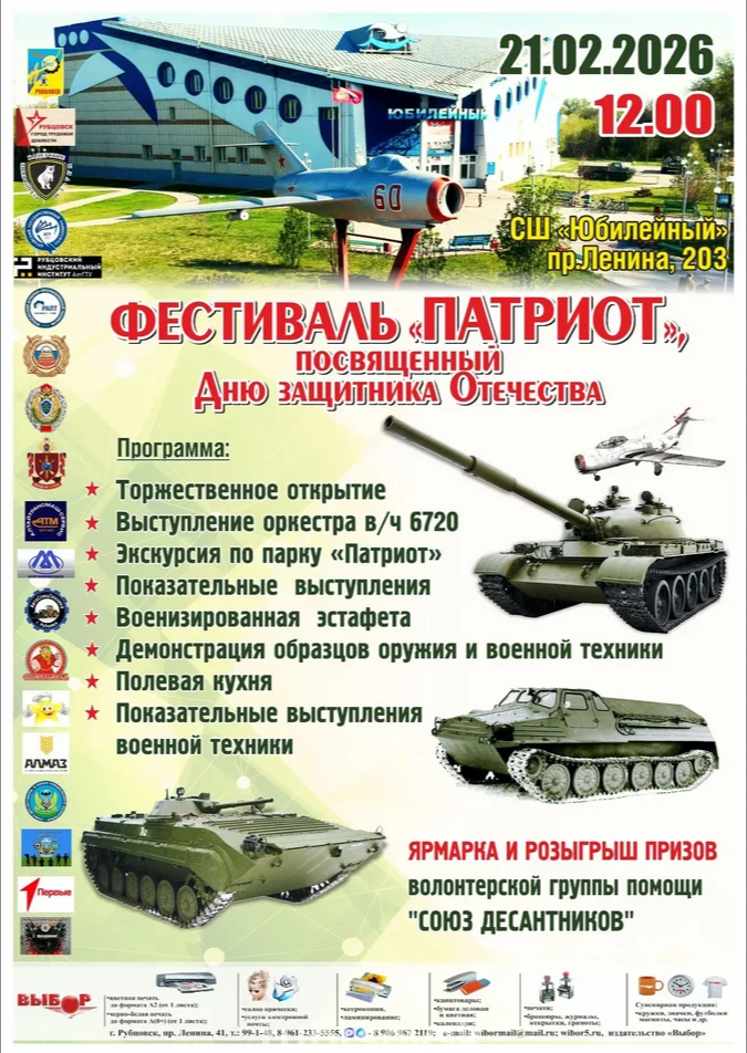 Программа военно-патриотического фестиваля «Патриот». Оперативно узнавайте главные новости в официальных каналах Администрации города Рубцовска в MAX и ВКонтакте. Афиша ТранспортДля садоводов Рубцовска возобновляют работу сезонные автобусные маршруты Чрезвычайные ситуации, Гражданская оборонаО гидрологической ситуации Формирование современной городской среды, БлагоустройствоСтартовал набор волонтёров для Всероссийского голосования за объекты благоустройства