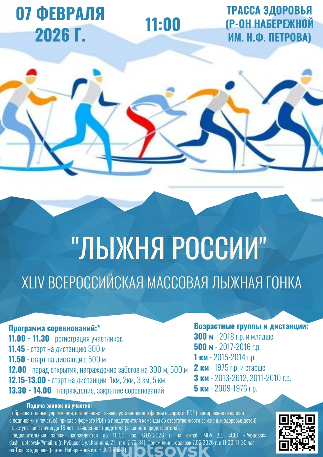 Групповые заявки на участие в лыжной гонке принимаются до 16:00 6 февраля по электронной почте СШ «Рубцовск»: dush_rubtsovsk@mail.ru, телефон для справок: 7-73-34.