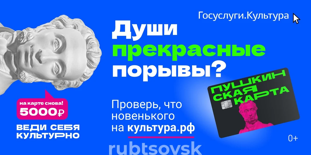 По «Пушкинской карте» в Рубцовске в 2025 году работали пять учреждений культуры: ДЮДК «Черёмушки», ДК «Алтайсельмаш», Рубцовский драматический театр, Театр кукол им. А.К. Брахмана, краеведческий музей. Всего по Пушкинской карте за 2025 год проведено 91 мероприятие, приобретено 3119 билетов. Так же по «Пушкинской карте» можно посмотреть российские фильмы в кинотеатрах «Жемчужина» и «Радуга».