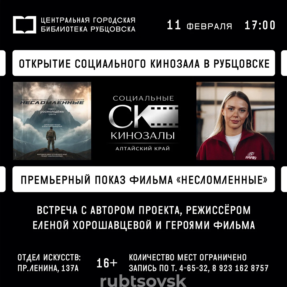 В открытии Социального кинозала в Рубцовске примет участие режиссёр Елена Хорошавцева. Она представит зрителям свой новый проект «Несломленные». Двое из героев фильма – наши земляки, участники специальной военной операции Егор Галкин и Михаил Попов – также станут гостями встречи.