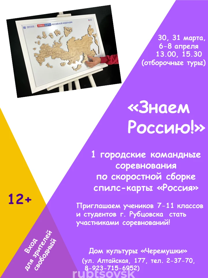 В Рубцовске пройдут первые городские командные соревнования «Знаем Россию!» по скоростной сборке спилс-карты «Россия».