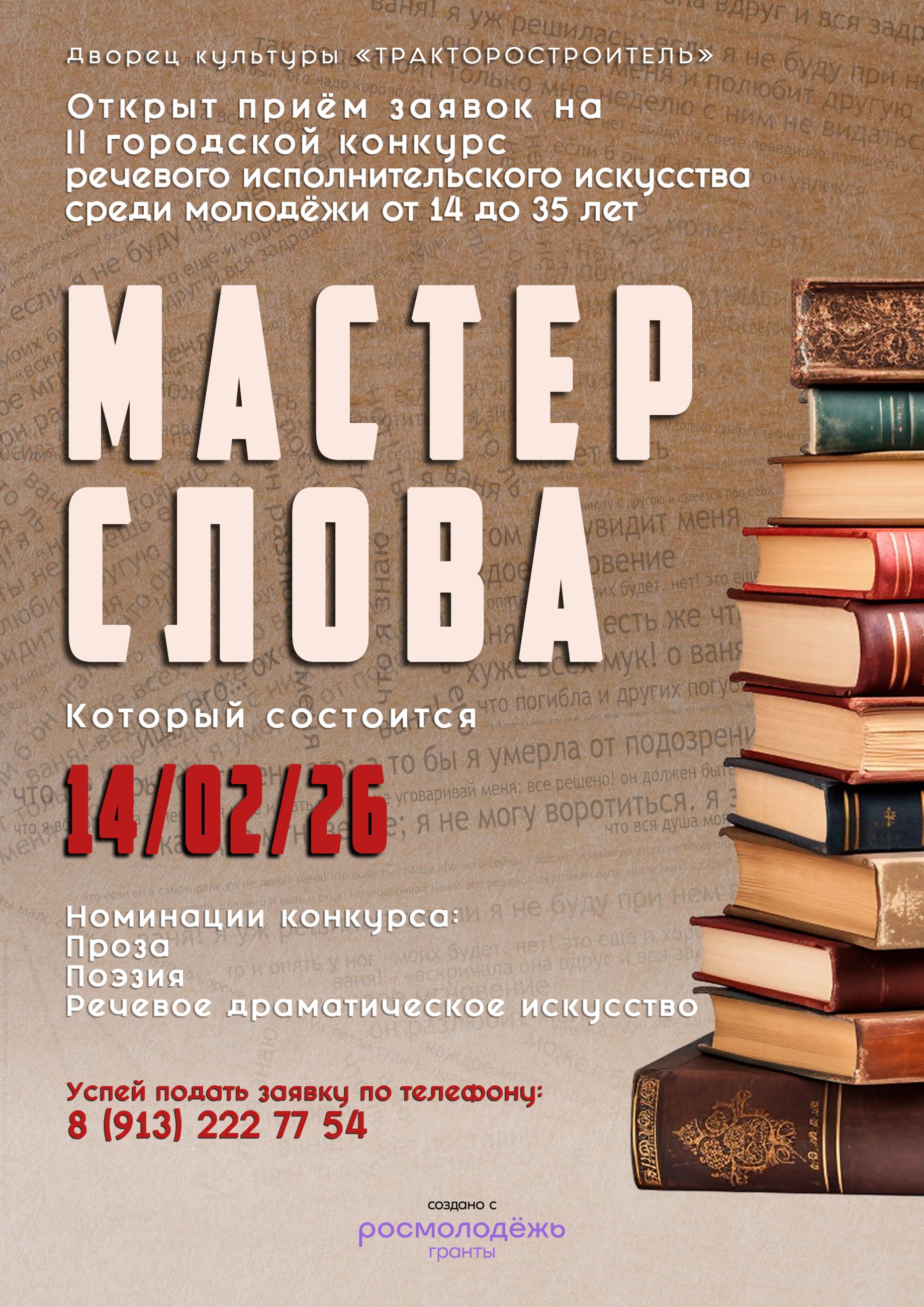 Управление культуры, спорта и молодёжной политики города Рубцовска объявляет о старте приёма заявок на II городской конкурс речевого исполнительского искусства «Мастер слова». Конкурс направлен на выявление и поддержку талантливой молодёжи, сохранение традиций отечественного художественного слова и развитие культуры публичного выступления.