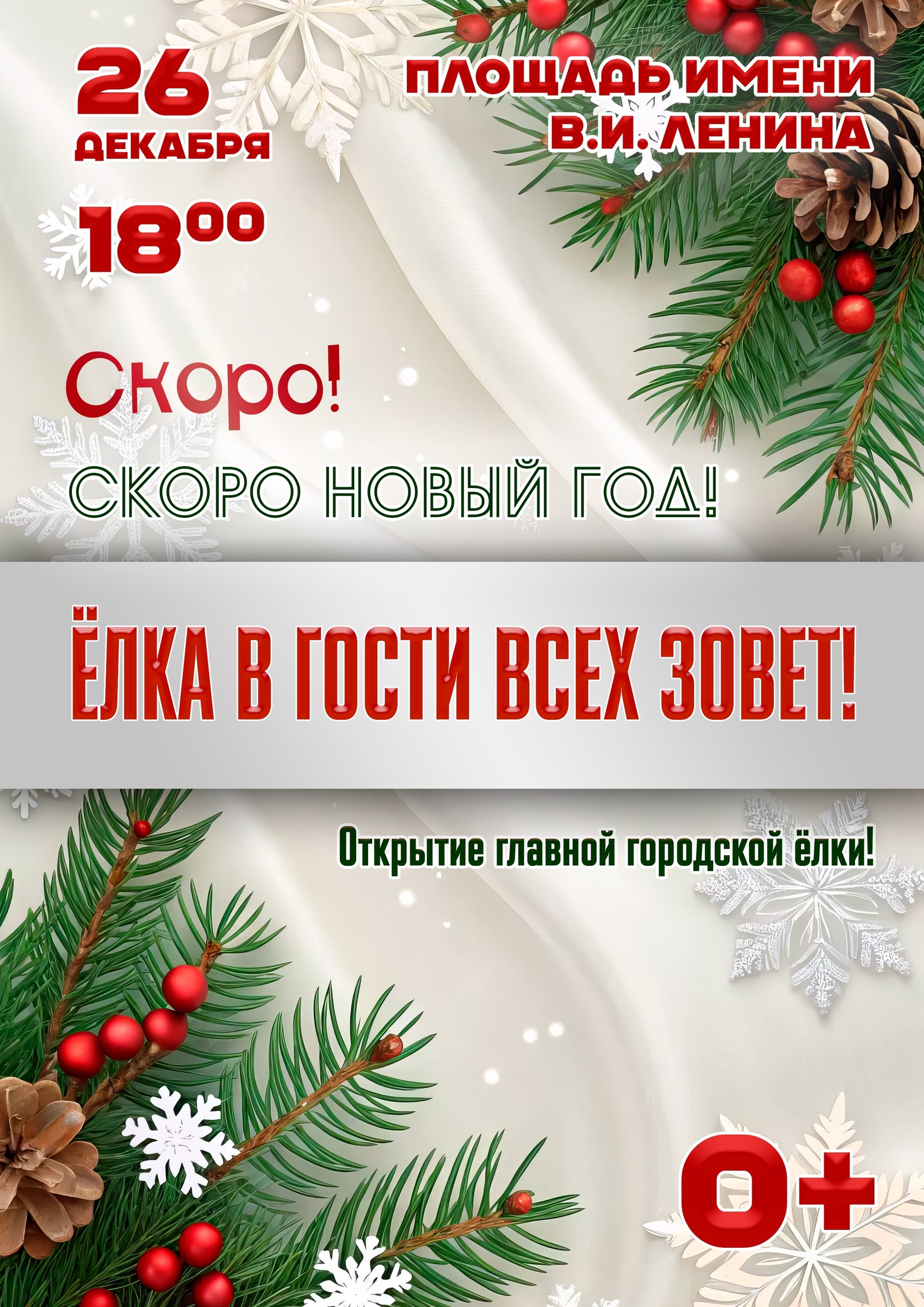 Уважаемые рубцовчане! Приглашаем вас на торжественное открытие главной городской ёлки. Праздничное мероприятие состоится сегодня в 18:00 на площади им. Ленина. Зрителей ждёт театрализованное представление со сказочными персонажами.