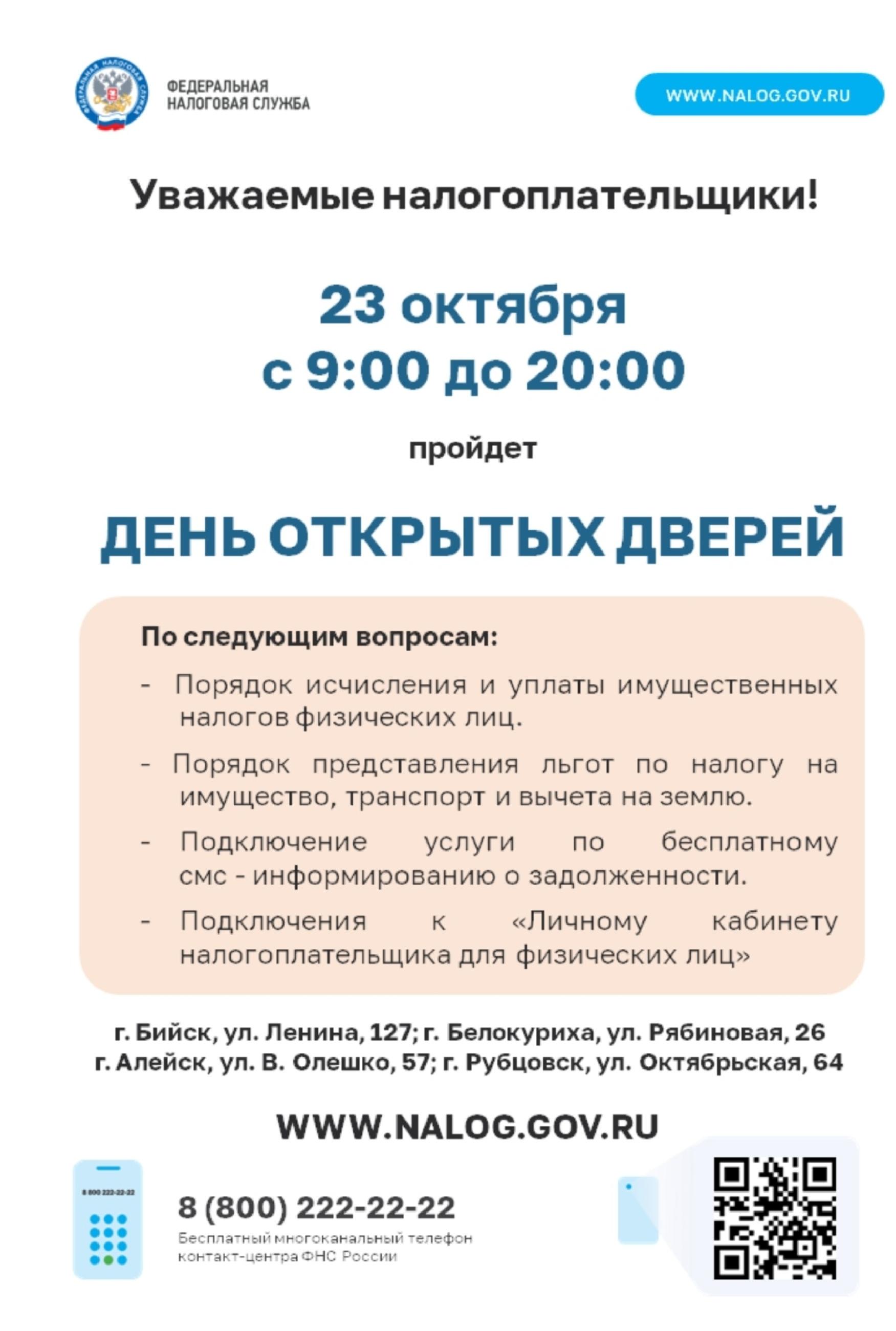 23 октября налоговая служба Алтайского края приглашает всех, у кого есть вопросы по начислению и уплате имущественных налогов, на День открытых дверей. В этот день налоговые инспекции будут работать с 9:00 до 20:00. В Межрайонной ИФНС России № 1 по Алтайскому краю акция пройдет по адресам: